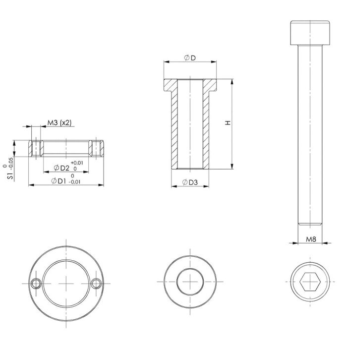 Med cylinderskruv, adapterhylsa och positioneringshylsa.