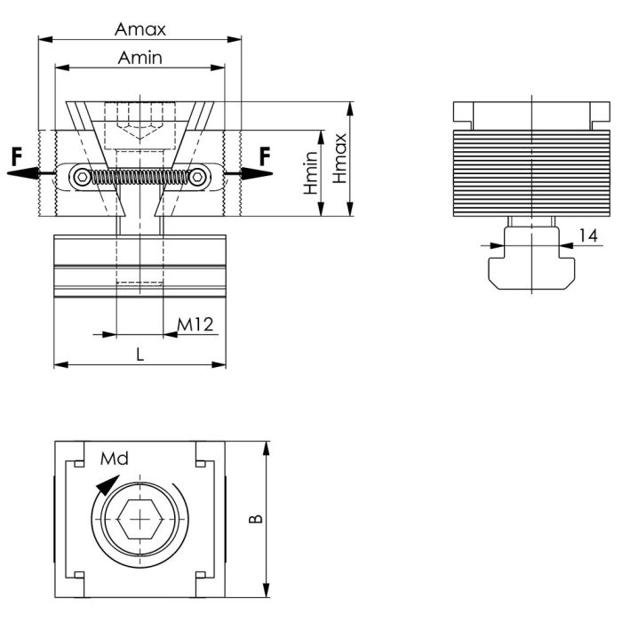 Spänningen sker via en insexskruv och kilenheten, som driver spännbacken och pressar arbetsstycket mot stoppet.