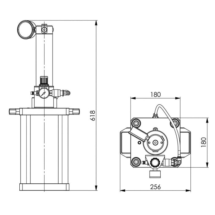 Utrustad med pneumatisk styrenhet för hydrauliskt utgångstryck, manometer samt nivåindikering.